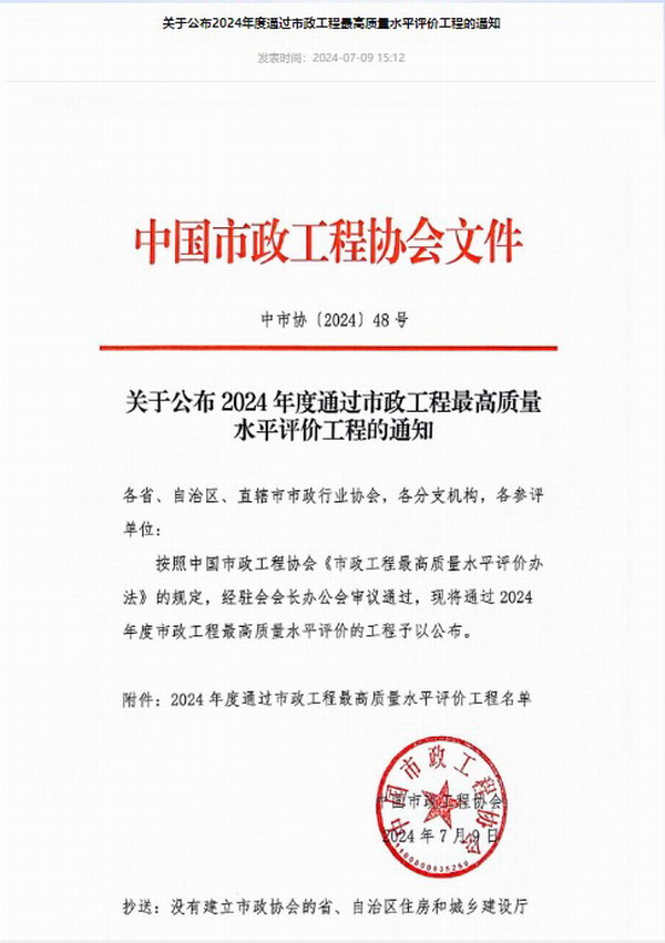 由中国市政工程协会组织实施,每年度评选一次,是中国市政工程行业在工程质量方面的最高水平评价,代表中国市政工程行业同时期国内先进水平。