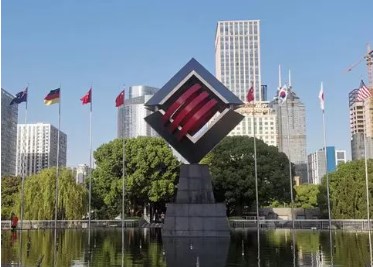 公园西入口处有雕塑《合作》及前来园区投资的各国国旗。