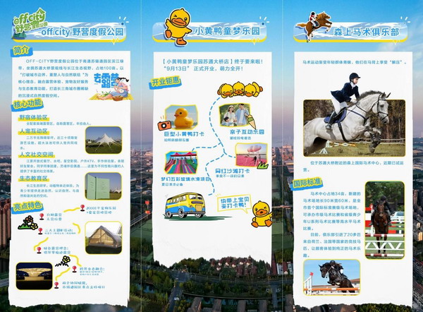 小黄鸭主题乐园总投资5000万元,占地150亩,创新采用故事线融入无动力设施的设计理念,打造全龄段沉浸式亲子游乐新地标。OFF-CITY野营基地占地100亩,打造南通首家规模最大、内容最丰富、全家庭参与为核心的萌宠友好及生态体验基地;推出首个帐篷节,突出“萌宠友好”与“创意露营”相结合特色,并设“创意帐篷展示评选”活动。森上马术俱乐部聚焦高端运动休闲,引入专业马术课程与高品质体验项目,筹办首届南通市马术锦标赛,积极推动江浙沪马术联赛。